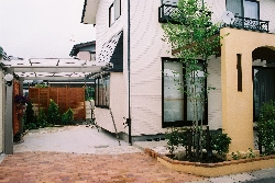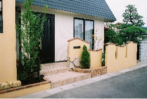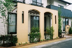 TOEXスカイエールを使って前面道路と建物の間にティータイムが楽しめる素敵なガーデンスペースが生まれました。門柱とのイメージも塗り壁仕上げで統一感があり素敵です。