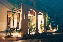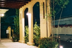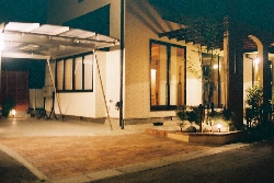 ---夜のライトアップが美しい光と影の空間を描きます---駐車スペースの奥には素敵な植栽スペースがあります。---通りからの視線もほどよくカットされパーゴラのあるおしゃれなガーデンスペース