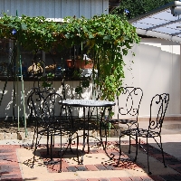 ▲テラスには温水シャワーでペットを洗ってあげられます。枕木にはリードフックを取り付けました。 |